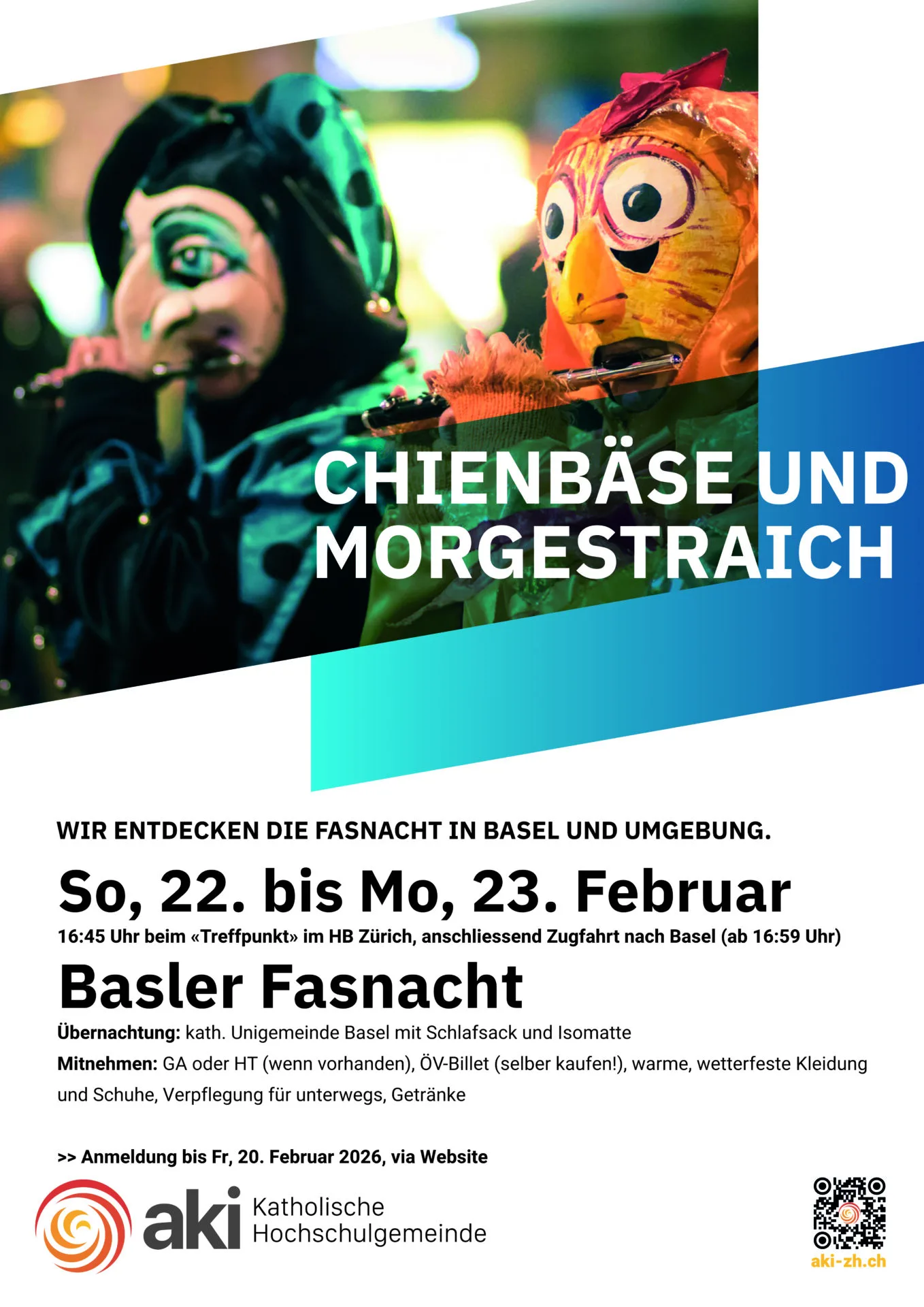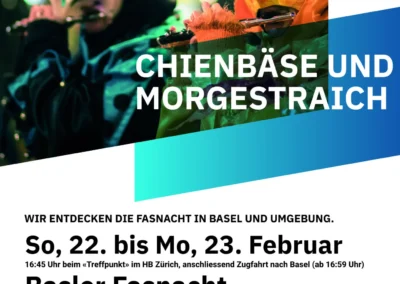 Wir treffen uns am Sonntag am Bahnhof HB und fahren zuerst nach Liestal, wo wir einen weiteren Fasnachtsbrauch, den Chienbäse (Kien = Tannenholz), besuchen. Dieser aus vorchristlicher Zeit stammender Brauch vertreibt symbolisch den Winter mit Feuerwagen und Fackeln. Nach dem Ende des Fackelumzugs fahren wir nach Basel, wo wir in den Räumlichkeiten der KUG (Kath. Unigemeinde) einige Stunden ruhen können, bevor wir um 03.00 aufstehen und uns aufmachen zum Morgestraich, der jedes Jahr pünktlich um 04.00 Uhr die 72-stündige Basler Fasnacht eintrommelt. Die abgedunkelte Innenstadt ist erleuchtet durch die Kopf- und Schulterlaternen und beschallt durch die Trommeln und Piccolos der Fasnachtsgruppen (Cliquen). Nachdem wir die Atmosphäre genossen haben, stärken wir uns mit einer Mehlsuppe und einem Käse- oder Zwiebelkuchen, bevor wir spätestens gegen 09.00 auf den Zug den Rückweg nach Zürich antreten. Frühere Abreise ist jederzeit möglich.